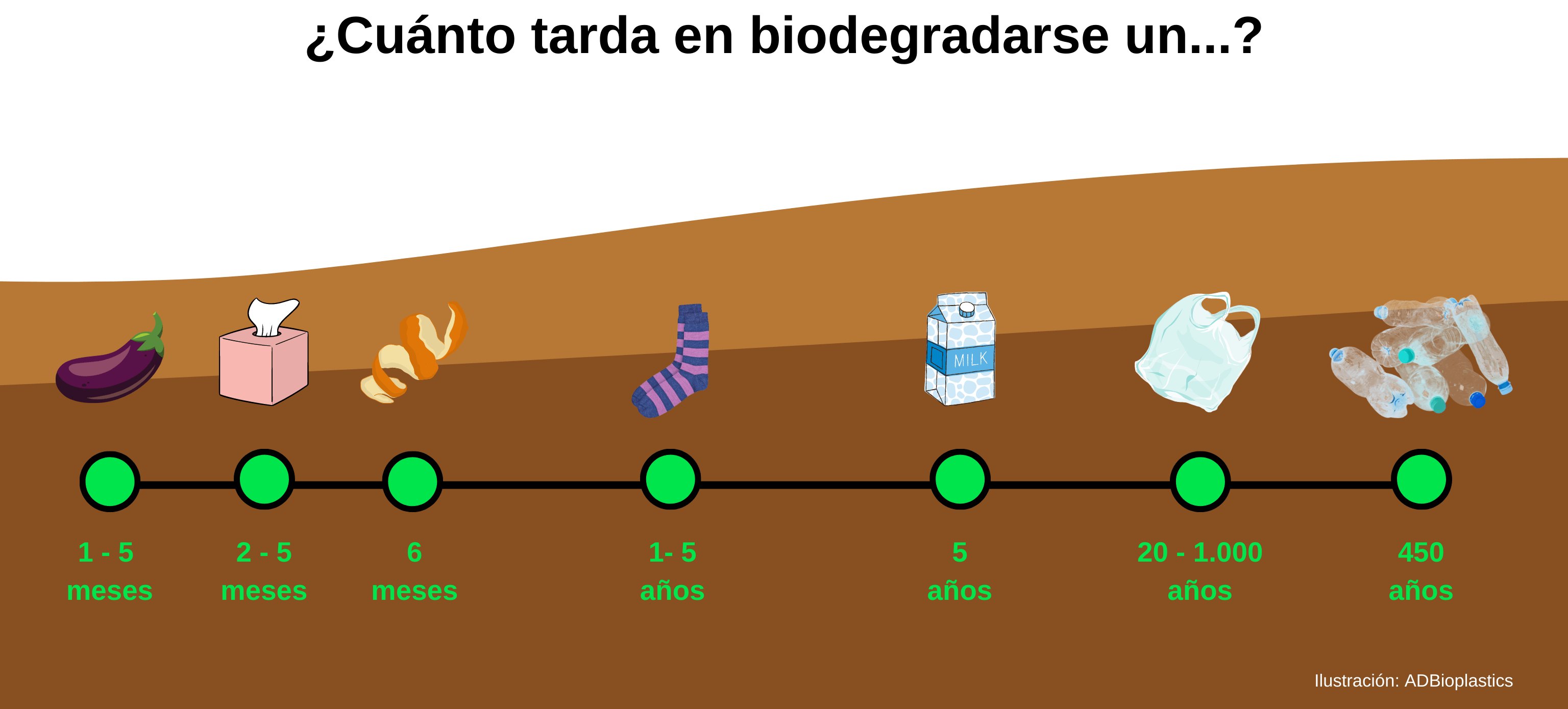 Para tener una idea de los tiempos que pueden tardar en biodegradarse algunos de los elementos más cotidianos, la siguiente ilustración muestra algunas aproximaciones de tiempo de biodegradabilidad de varios elementos en un entorno terrestre.