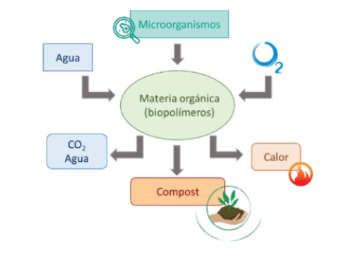 El proceso de compostaje permite el retorno de la materia orgánica al suelo y su reinserción en los ciclos naturales a través de imitar la transformación de la materia orgánica en la naturaleza (bajo condiciones aerobias y controladas), permitiendo homogenizar los materiales, higienizarlos y reducir su masa y volumen.